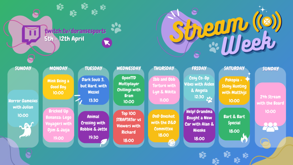 If you have never heard of stream week or you just want a little refresher: stream week is a week where Dorans members can take over our official Twitch channel and stream whatever their heart desires. You can do anything! Maybe you want to host a cooking show or maybe you’d like to play a horror game, you can do it all! All the money we earn from subs and donation will be donated to RAGweek.